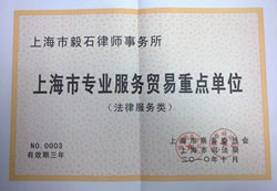 2010年12月,经上海市商务委员会和上海市司法局认定,本所成为首批12家“上海市专业服务贸易重点单位(法律服务类)”的律师事务所之一。12月23日,石毅主任应邀出席了市商委在新虹桥大厦举行的颁证仪式。