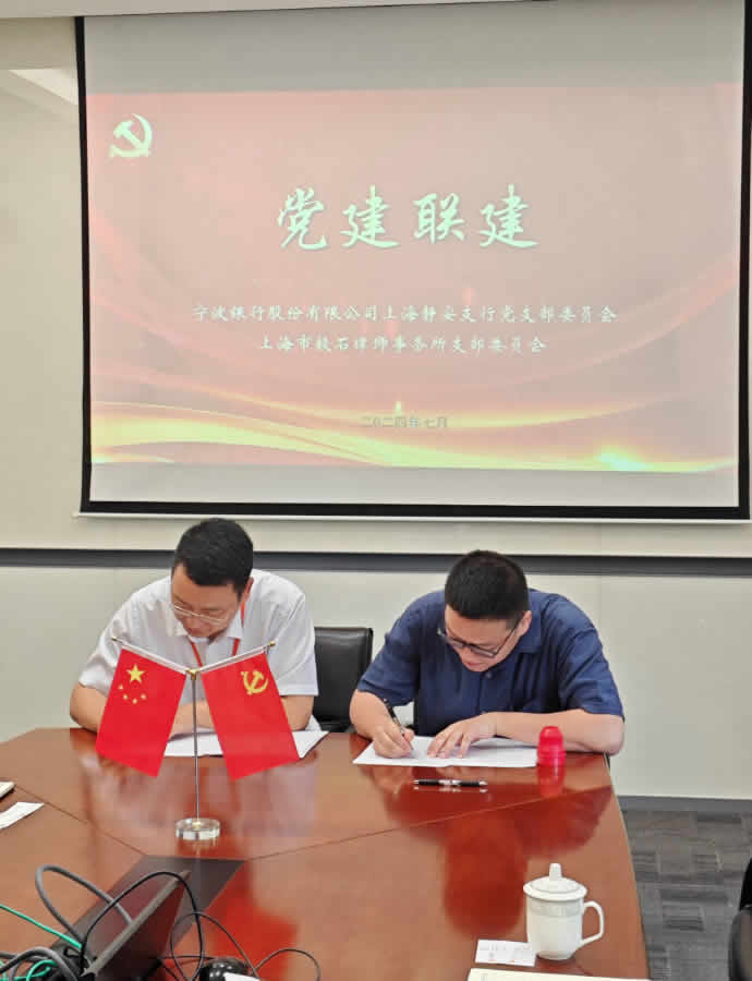 2024年7月3日上午,党建联建平台协议签署仪式在宁波银行上海静安支行会议室举行。宁波银行静安支行党支部书记、行长李陆华、部门总经理朱佳金、虞振维、朱佳金等支行领导出席签约仪式。毅石所党支部书记、管理合伙人梁成佳、高级合伙人李慕时等代表事务所党支部参加签约仪式。