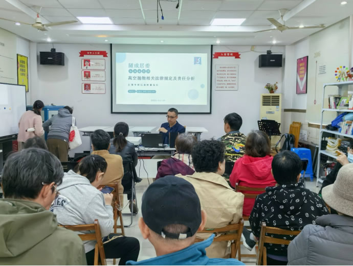 此次讲座面向社区一线居民开展,重点宣讲了近期社会关注度较高、和广大社区业主切身利益紧密关联的“高空抛物”入罪解读及实施此类违法行为的相关法律后果。为了让广大居民听得懂、学的进,打破专业法律宣讲和中老年群众法律认知能力之间的壁垒,褚江律师结合相关法院案例,用深入浅出的语言将严谨的法规条文具体、生动化,让广大社区群众从身边的人、身边的事着手,逐步了高空抛物罪的构成要件及严重危害性,有效提升了社区居民的安全责任意识,为积极减少社区安全隐患、维护广大社区居民“头顶上的安全”发挥了积极作用。讲座结束后,褚江律师还利用此次便民服务的机会回答了在座居民公房份额继承 、子女赡养义务等相关法律问题。